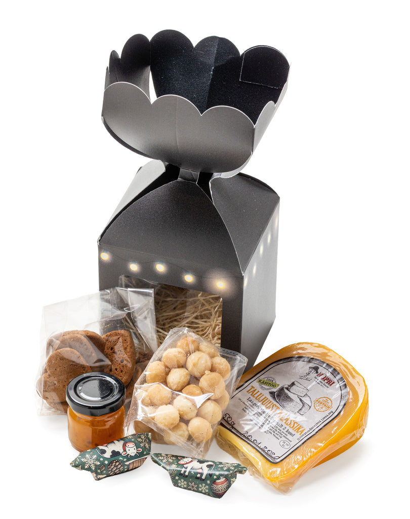 See kinkepakk toob pühadesse soojust ja ehtsat taluõhkkonda. Siit leiab pehme ja maheda Nopri Gouda Klassika, magusa murakamoosi, krõbedad makadaamiapähklid, nostalgilise lehmakommi ja traditsioonilise piparkoogi. Kingitus, mis toob naeratuse näole ja jõulurõõmu südamesse nii suurtele kui ka väikestele.