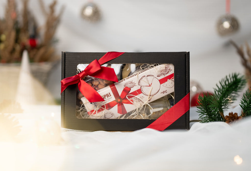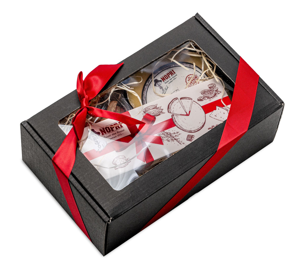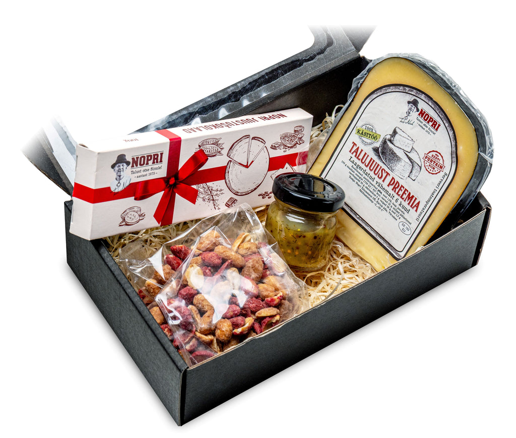 See jõulupakk on täis ehtsaid talumaitseid – Nopri Gouda Preemia, eriline Juustušokolaad, krõbedad meega röstitud maapähklid ja hõrk sinepikaste tilli ja meega. Kingitus, mis rõõmustab igat tõelist juustusõpra ja toob pidulauale sooja taluhõngu.