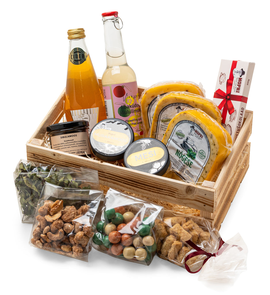 See rikkalik kinkepakk on loodud tõelisele maitsearmastajale, kes hindab nii traditsioone kui ka üllatusi. Siit leiab maitseküllased Nopri Nõgese-, Jalapeno- ja Kukeseene-Gouda juustud, magusa juustušokolaadi, värvilised šokolaadikrõmpsud ja murakamoosi, mis toovad rõõmu igale maiasmokale. Kõrvale lisavad tasakaalu makadaamiapähklid, sibulamoos ja värske ebaküdoonia limonaad. Komplekti täiendavad juustuküpsised, piparmünditee ja mesi – ehtne taluhellitus, mis soojendab hinge ja toob naeratuse näole.